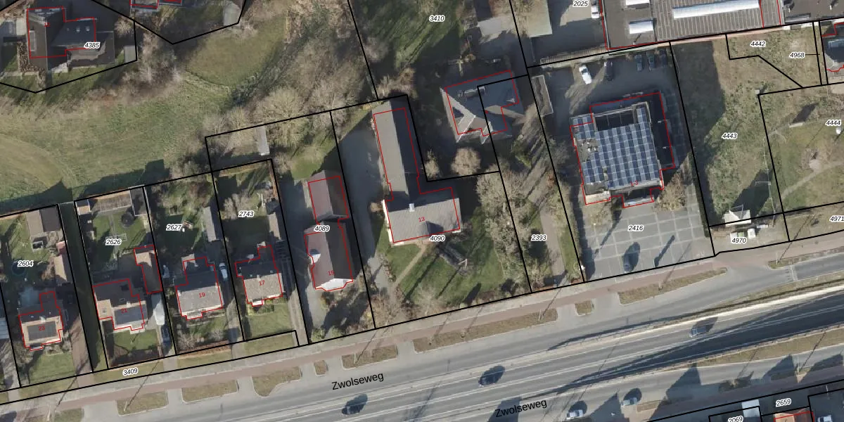 Zwolseweg 13 is gelegen op kadastraal perceel AVE00G4090. Deze kadastrale aanduiding is uniek en wordt gebruikt door het Kadaster om eigendomsrechten en andere zakelijke rechten vast te leggen. Het perceel maakt onderdeel uit van de kadastrale gemeente Avereest.