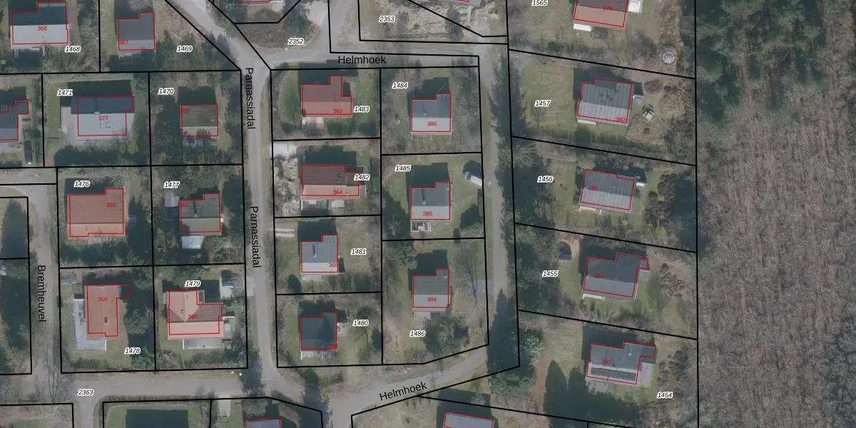 Het perceel waarop Helmhoek 385 staat heeft een oppervlakte van 478 m². Dit is een groot perceel. De perceeloppervlakte wordt geregistreerd door het Kadaster. Gedetailleerde informatie over de maten van dit perceel kunt u vinden in het rapport Kadastrale kaart met maatvoering van Helmhoek 385.