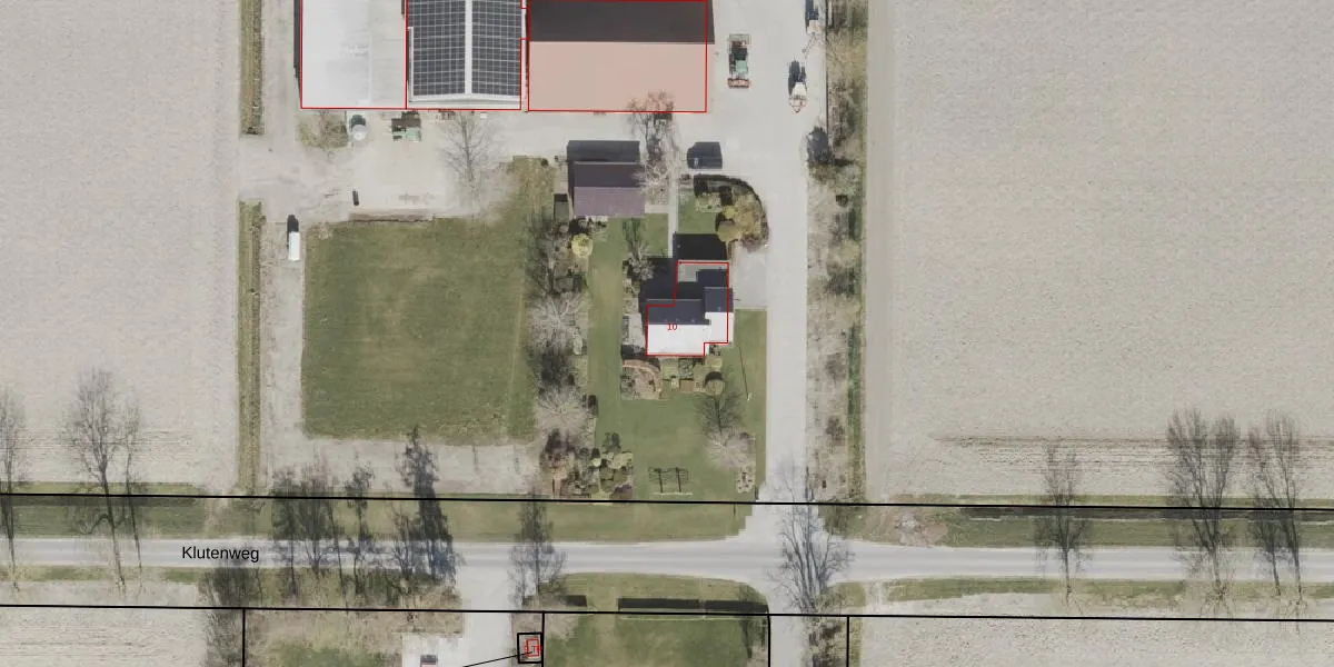 Het perceel waarop Klutenweg 10 staat heeft een oppervlakte van 18,9 ha. Dit is een zeer groot perceel. De perceeloppervlakte wordt geregistreerd door het Kadaster. Gedetailleerde informatie over de maten van dit perceel kunt u vinden in het rapport Kadastrale kaart met maatvoering van Klutenweg 10.