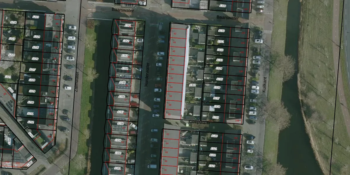 Het perceel waarop Harderwater 54 staat heeft een oppervlakte van 1170 m². Dit is een zeer groot perceel. De perceeloppervlakte wordt geregistreerd door het Kadaster. Gedetailleerde informatie over de maten van dit perceel kunt u vinden in het rapport Kadastrale kaart met maatvoering van Harderwater 54.