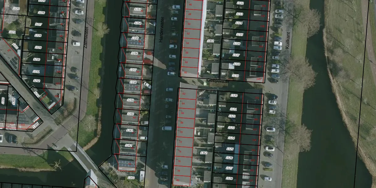 Het perceel waarop Harderwater 62 staat heeft een oppervlakte van 1170 m². Dit is een zeer groot perceel. De perceeloppervlakte wordt geregistreerd door het Kadaster. Gedetailleerde informatie over de maten van dit perceel kunt u vinden in het rapport Kadastrale kaart met maatvoering van Harderwater 62.