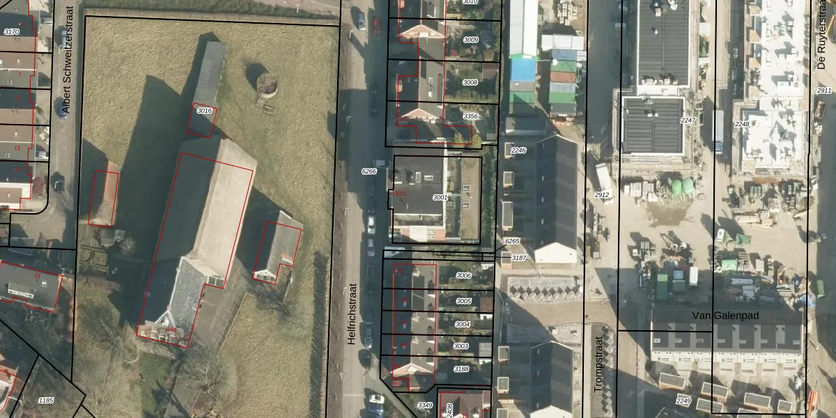 Het perceel waarop Helfrichstraat 17 staat heeft een oppervlakte van 445 m². Dit is een groot perceel. De perceeloppervlakte wordt geregistreerd door het Kadaster. Gedetailleerde informatie over de maten van dit perceel kunt u vinden in het rapport Kadastrale kaart met maatvoering van Helfrichstraat 17.