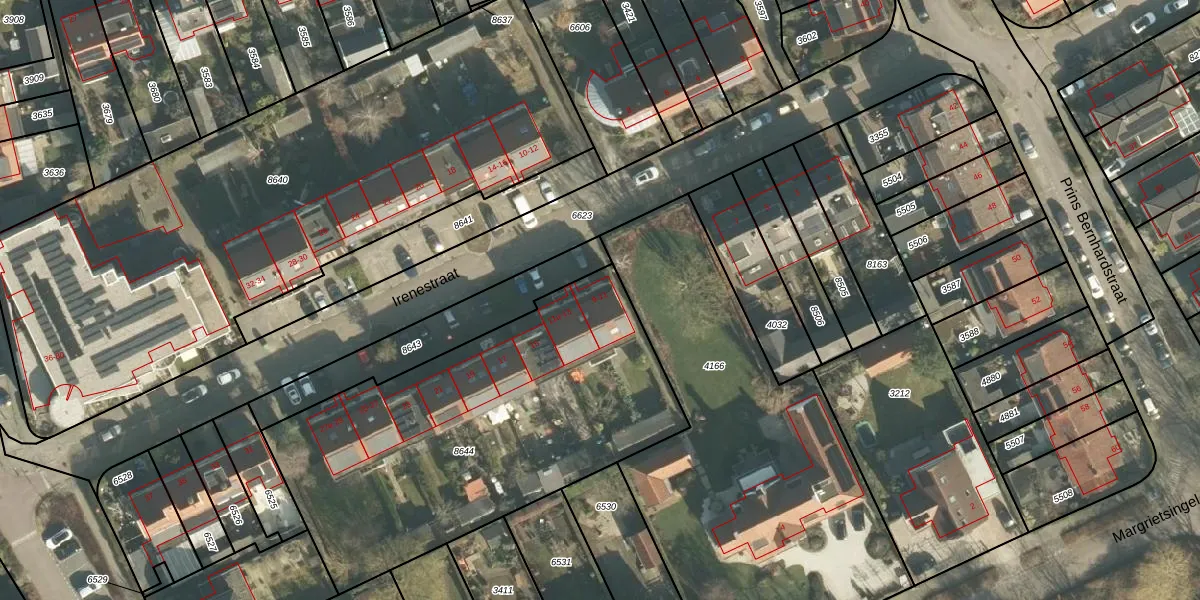 Het perceel waarop Irenestraat 9 staat heeft een oppervlakte van 1906 m². Dit is een zeer groot perceel. De perceeloppervlakte wordt geregistreerd door het Kadaster. Gedetailleerde informatie over de maten van dit perceel kunt u vinden in het rapport Kadastrale kaart met maatvoering van Irenestraat 9.