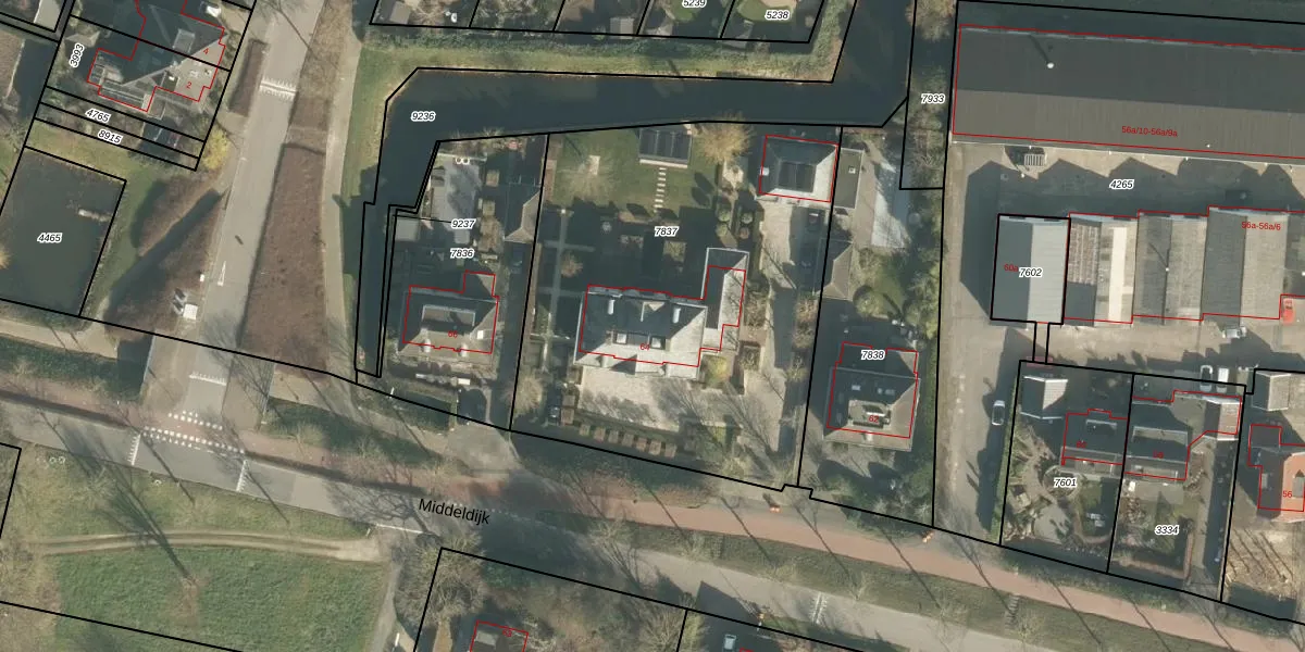 Het perceel waarop Middeldijk 64 staat heeft een oppervlakte van 2318 m². Dit is een zeer groot perceel. De perceeloppervlakte wordt geregistreerd door het Kadaster. Gedetailleerde informatie over de maten van dit perceel kunt u vinden in het rapport Kadastrale kaart met maatvoering van Middeldijk 64.