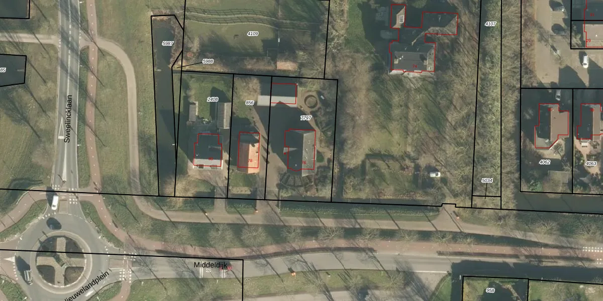 Het perceel waarop Middeldijk 76 staat heeft een oppervlakte van 880 m². Dit is een groot perceel. De perceeloppervlakte wordt geregistreerd door het Kadaster. Gedetailleerde informatie over de maten van dit perceel kunt u vinden in het rapport Kadastrale kaart met maatvoering van Middeldijk 76.
