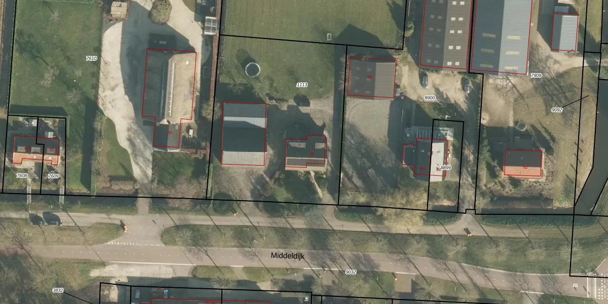 Het perceel waarop Middeldijk 88 staat heeft een oppervlakte van 2315 m². Dit is een zeer groot perceel. De perceeloppervlakte wordt geregistreerd door het Kadaster. Gedetailleerde informatie over de maten van dit perceel kunt u vinden in het rapport Kadastrale kaart met maatvoering van Middeldijk 88.