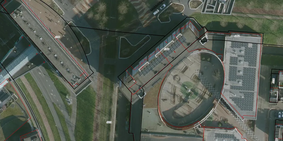 Het perceel waarop Middeldijkerplein 23 staat heeft een oppervlakte van 1425 m². Dit is een zeer groot perceel. De perceeloppervlakte wordt geregistreerd door het Kadaster. Gedetailleerde informatie over de maten van dit perceel kunt u vinden in het rapport Kadastrale kaart met maatvoering van Middeldijkerplein 23.