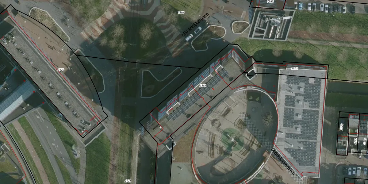 Het perceel waarop Middeldijkerplein 73 staat heeft een oppervlakte van 1425 m². Dit is een zeer groot perceel. De perceeloppervlakte wordt geregistreerd door het Kadaster. Gedetailleerde informatie over de maten van dit perceel kunt u vinden in het rapport Kadastrale kaart met maatvoering van Middeldijkerplein 73.