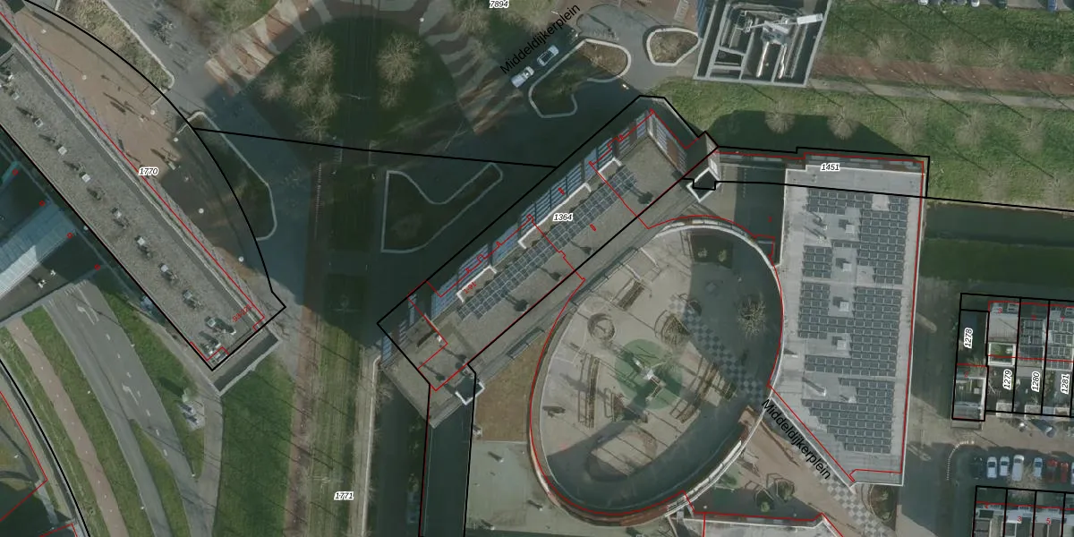 Het perceel waarop Middeldijkerplein 77 staat heeft een oppervlakte van 1425 m². Dit is een zeer groot perceel. De perceeloppervlakte wordt geregistreerd door het Kadaster. Gedetailleerde informatie over de maten van dit perceel kunt u vinden in het rapport Kadastrale kaart met maatvoering van Middeldijkerplein 77.