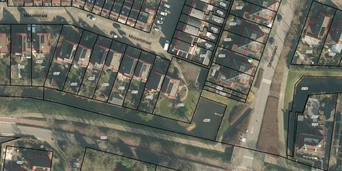 Het perceel waarop Mozartstraat 26 staat heeft een oppervlakte van 800 m². Dit is een groot perceel. De perceeloppervlakte wordt geregistreerd door het Kadaster. Gedetailleerde informatie over de maten van dit perceel kunt u vinden in het rapport Kadastrale kaart met maatvoering van Mozartstraat 26.