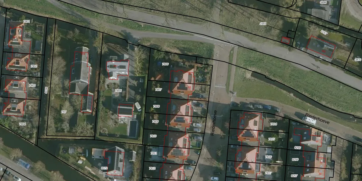 Riederhoeve 16 is gelegen op kadastraal perceel BRD00B7807. Deze kadastrale aanduiding is uniek en wordt gebruikt door het Kadaster om eigendomsrechten en andere zakelijke rechten vast te leggen. Het perceel maakt onderdeel uit van de kadastrale gemeente Barendrecht.