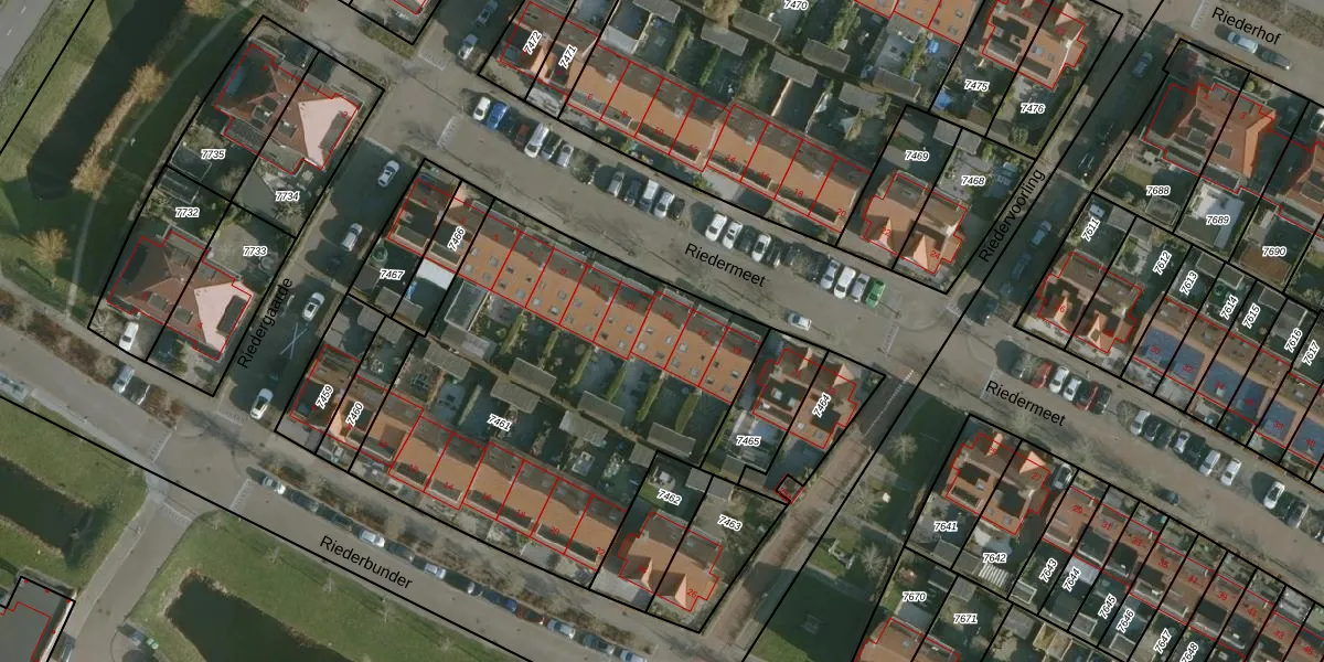 Het perceel waarop Riedermeet 15 staat heeft een oppervlakte van 2025 m². Dit is een zeer groot perceel. De perceeloppervlakte wordt geregistreerd door het Kadaster. Gedetailleerde informatie over de maten van dit perceel kunt u vinden in het rapport Kadastrale kaart met maatvoering van Riedermeet 15.