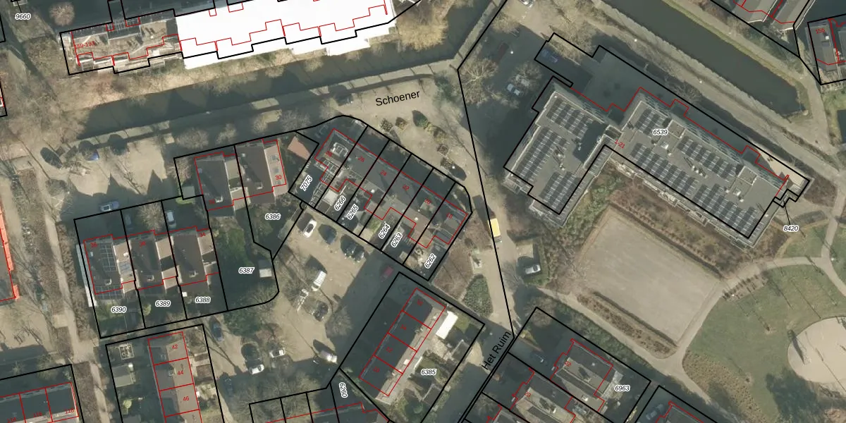 Schoener 20 is gelegen op kadastraal perceel BRD00D6263. Deze kadastrale aanduiding is uniek en wordt gebruikt door het Kadaster om eigendomsrechten en andere zakelijke rechten vast te leggen. Het perceel maakt onderdeel uit van de kadastrale gemeente Barendrecht.