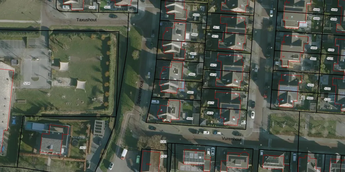 Het perceel waarop Sparrenhout 16 staat heeft een oppervlakte van 300 m². Dit is een groot perceel. De perceeloppervlakte wordt geregistreerd door het Kadaster. Gedetailleerde informatie over de maten van dit perceel kunt u vinden in het rapport Kadastrale kaart met maatvoering van Sparrenhout 16.