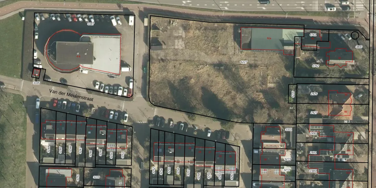 Het perceel waarop Van der Meulenstraat 10-a staat heeft een oppervlakte van 4123 m². Dit is een zeer groot perceel. De perceeloppervlakte wordt geregistreerd door het Kadaster. Gedetailleerde informatie over de maten van dit perceel kunt u vinden in het rapport Kadastrale kaart met maatvoering van Van der Meulenstraat 10-a.