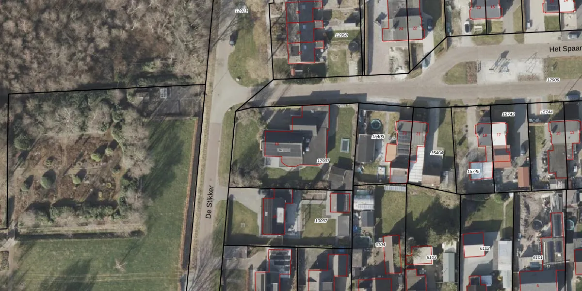 Het perceel waarop De Stikker 18 staat heeft een oppervlakte van 1213 m². Dit is een zeer groot perceel. De perceeloppervlakte wordt geregistreerd door het Kadaster. Gedetailleerde informatie over de maten van dit perceel kunt u vinden in het rapport Kadastrale kaart met maatvoering van De Stikker 18.