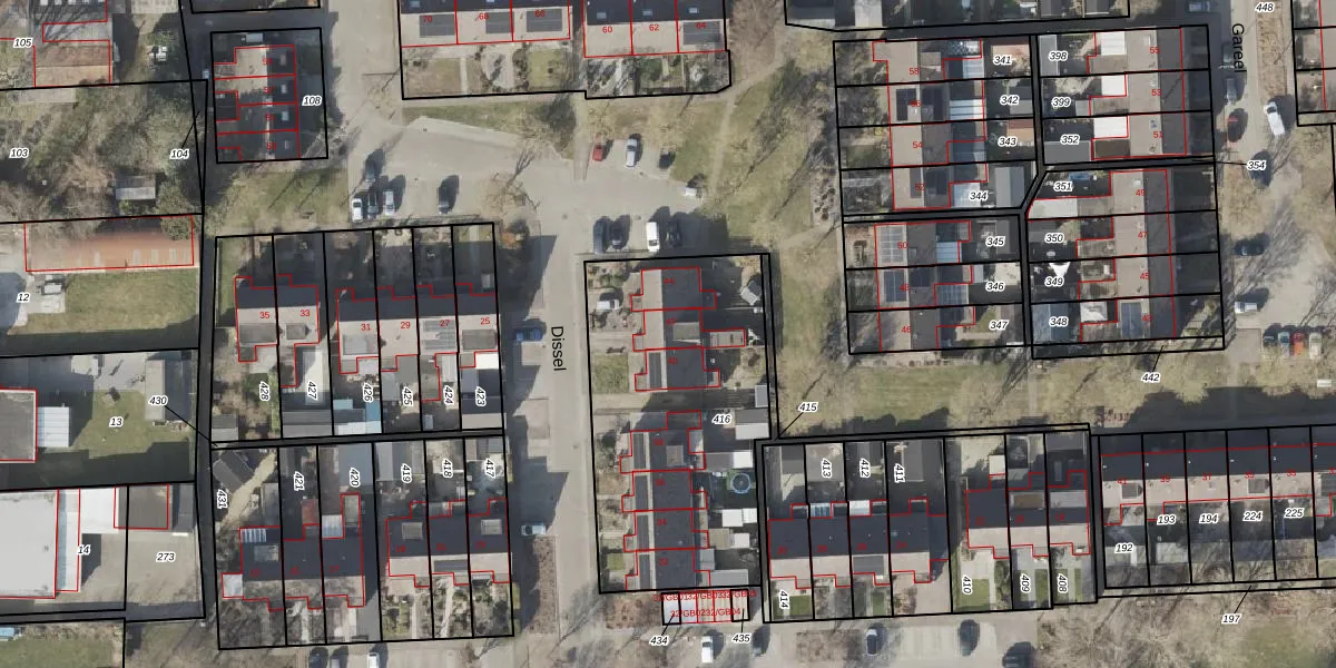 Het perceel waarop Dissel 42 staat heeft een oppervlakte van 1267 m². Dit is een zeer groot perceel. De perceeloppervlakte wordt geregistreerd door het Kadaster. Gedetailleerde informatie over de maten van dit perceel kunt u vinden in het rapport Kadastrale kaart met maatvoering van Dissel 42.