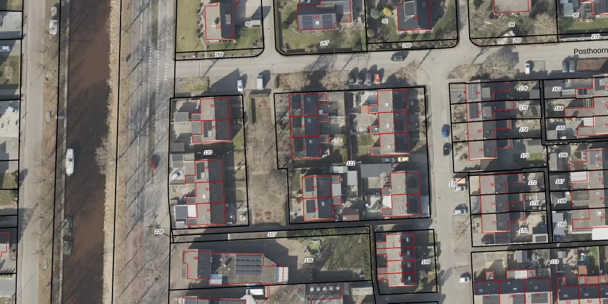 Het perceel waarop Posthoorn 85 staat heeft een oppervlakte van 2070 m². Dit is een zeer groot perceel. De perceeloppervlakte wordt geregistreerd door het Kadaster. Gedetailleerde informatie over de maten van dit perceel kunt u vinden in het rapport Kadastrale kaart met maatvoering van Posthoorn 85.