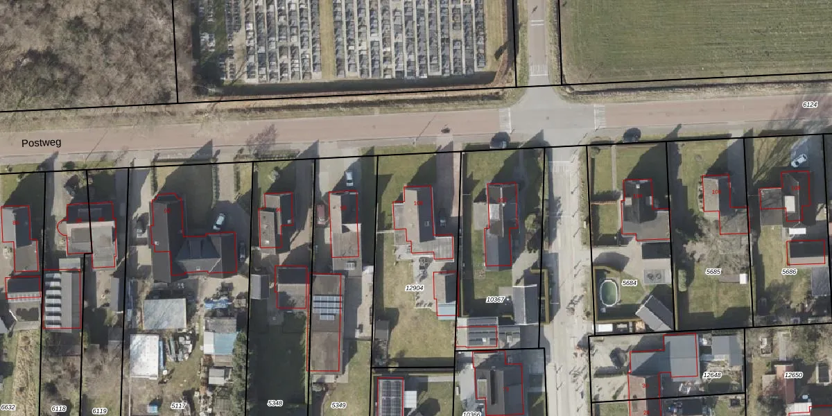 Het perceel waarop Postweg 100 staat heeft een oppervlakte van 1030 m². Dit is een zeer groot perceel. De perceeloppervlakte wordt geregistreerd door het Kadaster. Gedetailleerde informatie over de maten van dit perceel kunt u vinden in het rapport Kadastrale kaart met maatvoering van Postweg 100.