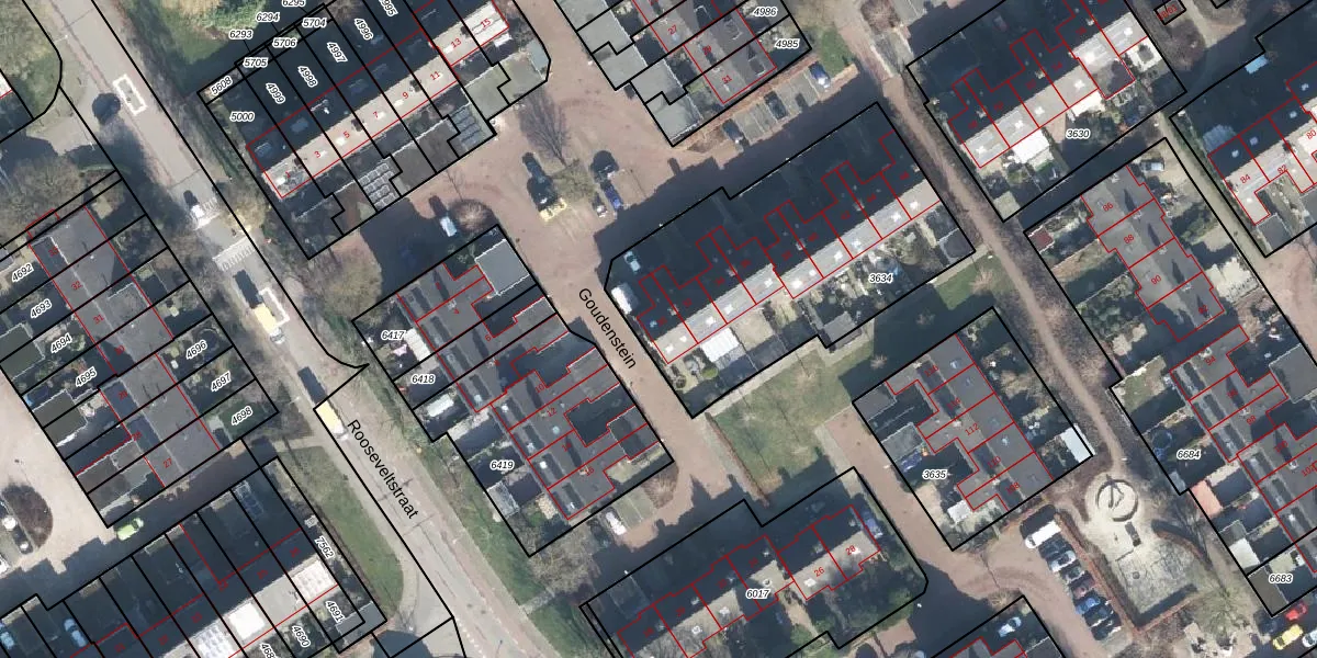 Het perceel waarop Goudenstein 30 staat heeft een oppervlakte van 1336 m². Dit is een zeer groot perceel. De perceeloppervlakte wordt geregistreerd door het Kadaster. Gedetailleerde informatie over de maten van dit perceel kunt u vinden in het rapport Kadastrale kaart met maatvoering van Goudenstein 30.
