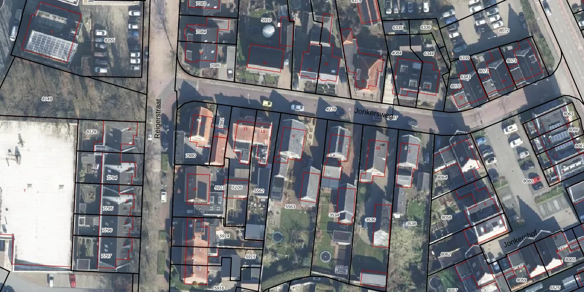 Het perceel waarop Jonkersweg 9 staat heeft een oppervlakte van 976 m². Dit is een groot perceel. De perceeloppervlakte wordt geregistreerd door het Kadaster. Gedetailleerde informatie over de maten van dit perceel kunt u vinden in het rapport Kadastrale kaart met maatvoering van Jonkersweg 9.