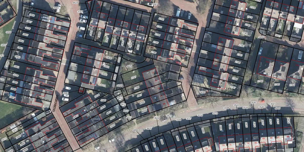 Het perceel waarop Molecaten 77 staat heeft een oppervlakte van 308 m². Dit is een groot perceel. De perceeloppervlakte wordt geregistreerd door het Kadaster. Gedetailleerde informatie over de maten van dit perceel kunt u vinden in het rapport Kadastrale kaart met maatvoering van Molecaten 77.