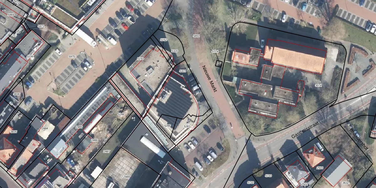 Het perceel waarop Nieuwe Markt 1-H staat heeft een oppervlakte van 718 m². Dit is een groot perceel. De perceeloppervlakte wordt geregistreerd door het Kadaster. Gedetailleerde informatie over de maten van dit perceel kunt u vinden in het rapport Kadastrale kaart met maatvoering van Nieuwe Markt 1-H.