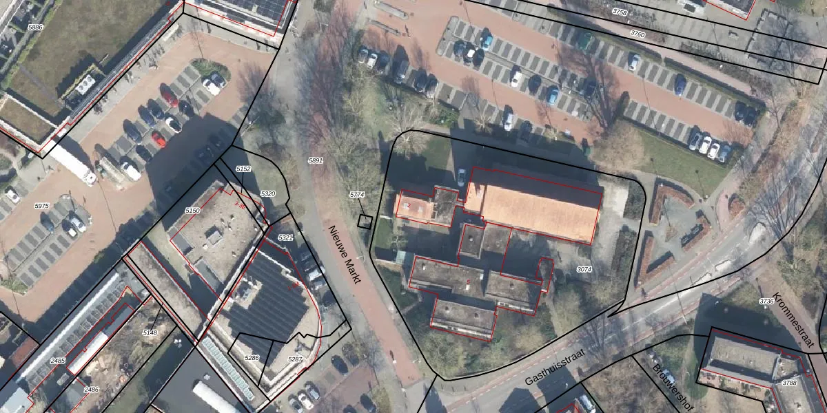 Het perceel waarop Nieuwe Markt 2 staat heeft een oppervlakte van 2863 m². Dit is een zeer groot perceel. De perceeloppervlakte wordt geregistreerd door het Kadaster. Gedetailleerde informatie over de maten van dit perceel kunt u vinden in het rapport Kadastrale kaart met maatvoering van Nieuwe Markt 2.