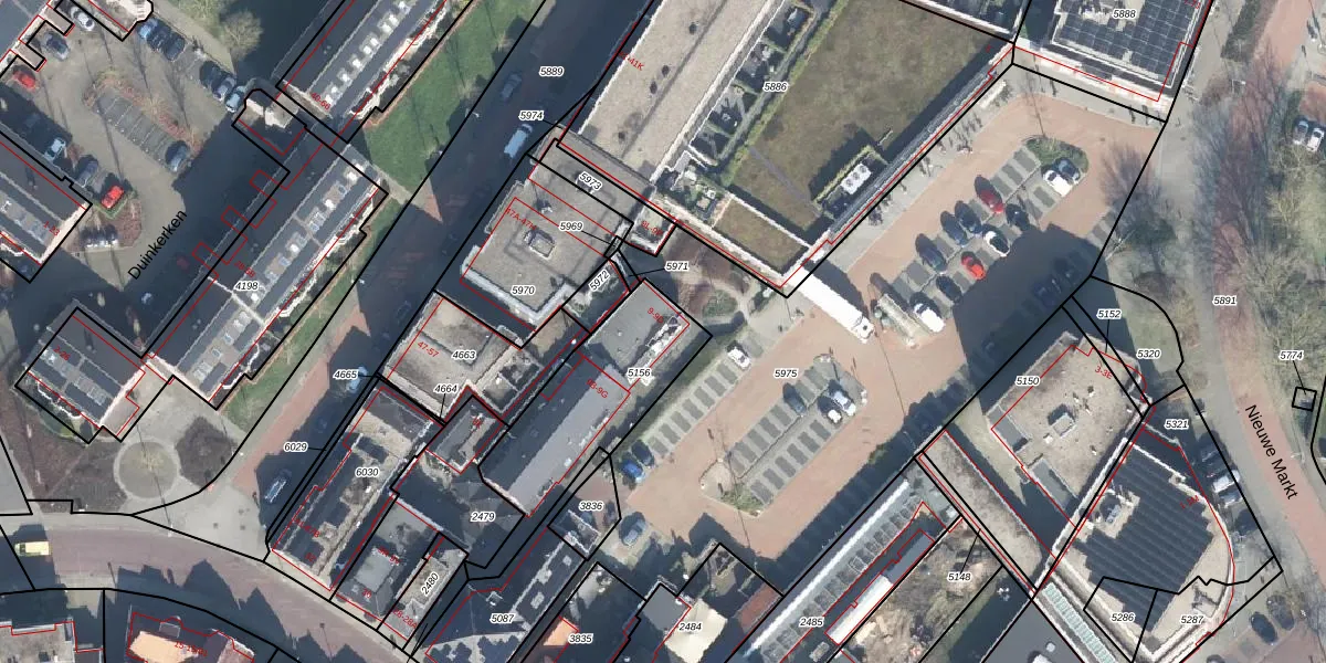 Het perceel waarop Nieuwe Markt 9-D staat heeft een oppervlakte van 548 m². Dit is een groot perceel. De perceeloppervlakte wordt geregistreerd door het Kadaster. Gedetailleerde informatie over de maten van dit perceel kunt u vinden in het rapport Kadastrale kaart met maatvoering van Nieuwe Markt 9-D.