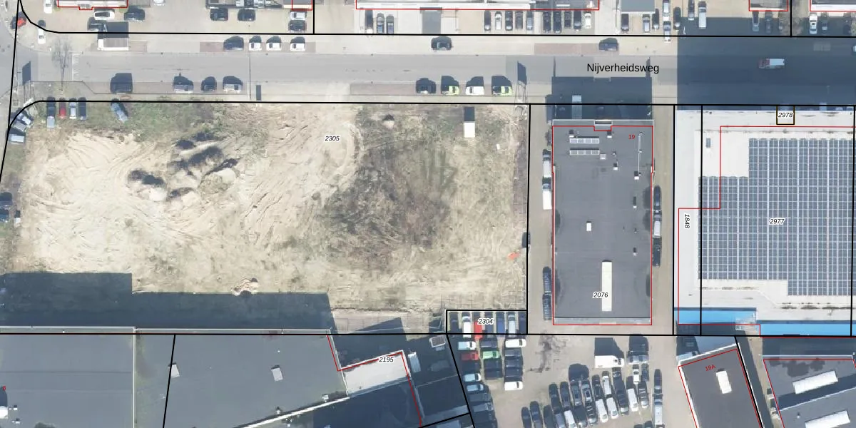 Het perceel waarop Nijverheidsweg 21 staat heeft een oppervlakte van 6654 m². Dit is een zeer groot perceel. De perceeloppervlakte wordt geregistreerd door het Kadaster. Gedetailleerde informatie over de maten van dit perceel kunt u vinden in het rapport Kadastrale kaart met maatvoering van Nijverheidsweg 21.