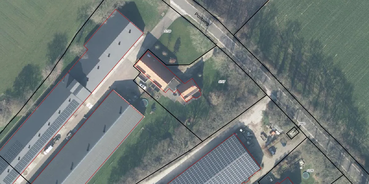 Postweg 5 is gelegen op kadastraal perceel BNV00F1717. Deze kadastrale aanduiding is uniek en wordt gebruikt door het Kadaster om eigendomsrechten en andere zakelijke rechten vast te leggen. Het perceel maakt onderdeel uit van de kadastrale gemeente Barneveld.