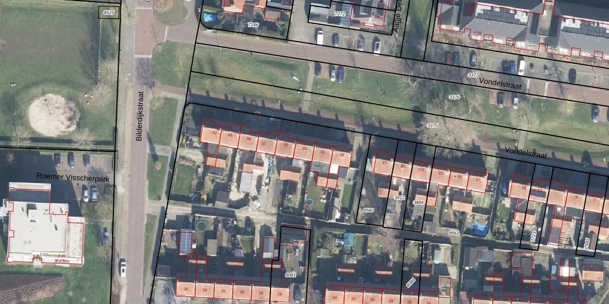Het perceel waarop Vondelstraat 33 staat heeft een oppervlakte van 8203 m². Dit is een zeer groot perceel. De perceeloppervlakte wordt geregistreerd door het Kadaster. Gedetailleerde informatie over de maten van dit perceel kunt u vinden in het rapport Kadastrale kaart met maatvoering van Vondelstraat 33.