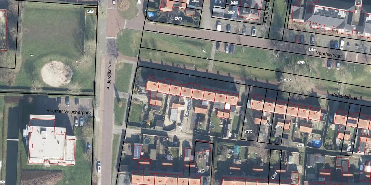 Het perceel waarop Vondelstraat 37 staat heeft een oppervlakte van 8203 m². Dit is een zeer groot perceel. De perceeloppervlakte wordt geregistreerd door het Kadaster. Gedetailleerde informatie over de maten van dit perceel kunt u vinden in het rapport Kadastrale kaart met maatvoering van Vondelstraat 37.