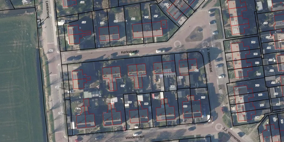 Het perceel waarop Kerkstraat 8 staat heeft een oppervlakte van 2877 m². Dit is een zeer groot perceel. De perceeloppervlakte wordt geregistreerd door het Kadaster. Gedetailleerde informatie over de maten van dit perceel kunt u vinden in het rapport Kadastrale kaart met maatvoering van Kerkstraat 8.