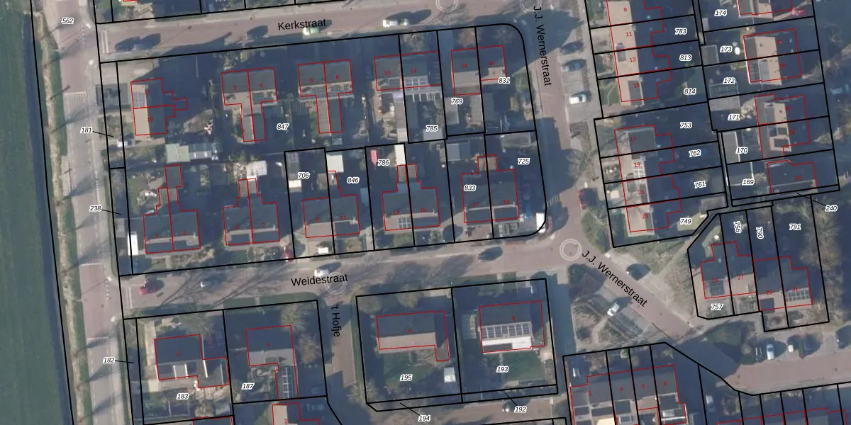 Het perceel waarop Weidestraat 15 staat heeft een oppervlakte van 2877 m². Dit is een zeer groot perceel. De perceeloppervlakte wordt geregistreerd door het Kadaster. Gedetailleerde informatie over de maten van dit perceel kunt u vinden in het rapport Kadastrale kaart met maatvoering van Weidestraat 15.