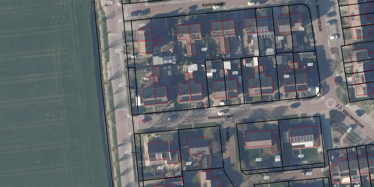 Het perceel waarop Weidestraat 5 staat heeft een oppervlakte van 2877 m². Dit is een zeer groot perceel. De perceeloppervlakte wordt geregistreerd door het Kadaster. Gedetailleerde informatie over de maten van dit perceel kunt u vinden in het rapport Kadastrale kaart met maatvoering van Weidestraat 5.