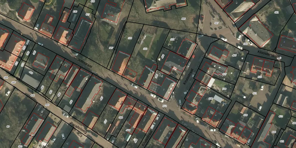 Grootestraat 15 is gelegen op kadastraal perceel BTB00D102. Deze kadastrale aanduiding is uniek en wordt gebruikt door het Kadaster om eigendomsrechten en andere zakelijke rechten vast te leggen. Het perceel maakt onderdeel uit van de kadastrale gemeente Batenburg.