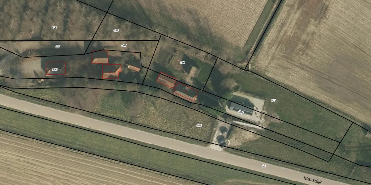 Maasdijk 5 is gelegen op kadastraal perceel BTB00E305. Deze kadastrale aanduiding is uniek en wordt gebruikt door het Kadaster om eigendomsrechten en andere zakelijke rechten vast te leggen. Het perceel maakt onderdeel uit van de kadastrale gemeente Batenburg.