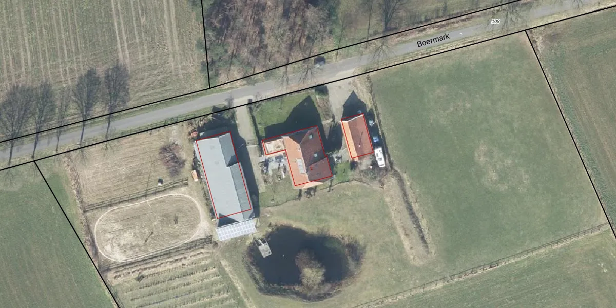 Het perceel waarop Boermark 2 staat heeft een oppervlakte van 2,4 ha. Dit is een zeer groot perceel. De perceeloppervlakte wordt geregistreerd door het Kadaster. Gedetailleerde informatie over de maten van dit perceel kunt u vinden in het rapport Kadastrale kaart met maatvoering van Boermark 2.