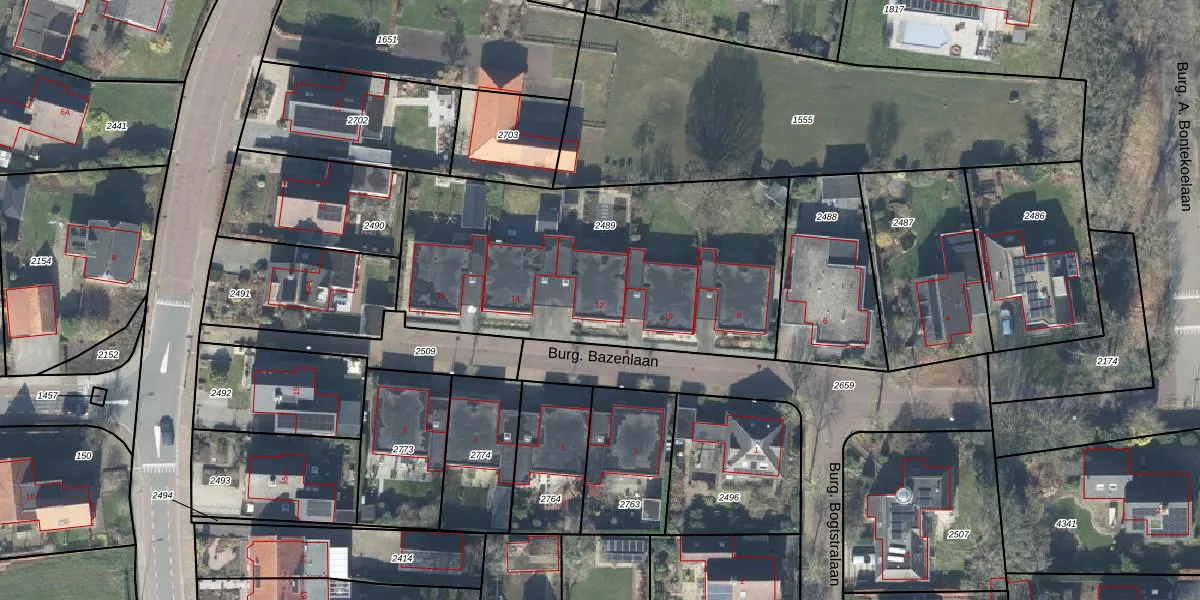 Het perceel waarop Burg. Bazenlaan 12 staat heeft een oppervlakte van 1727 m². Dit is een zeer groot perceel. De perceeloppervlakte wordt geregistreerd door het Kadaster. Gedetailleerde informatie over de maten van dit perceel kunt u vinden in het rapport Kadastrale kaart met maatvoering van Burg. Bazenlaan 12.