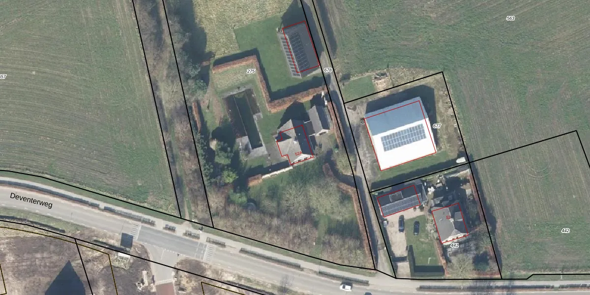 Het perceel waarop Deventerweg 52-A staat heeft een oppervlakte van 5876 m². Dit is een zeer groot perceel. De perceeloppervlakte wordt geregistreerd door het Kadaster. Gedetailleerde informatie over de maten van dit perceel kunt u vinden in het rapport Kadastrale kaart met maatvoering van Deventerweg 52-A.
