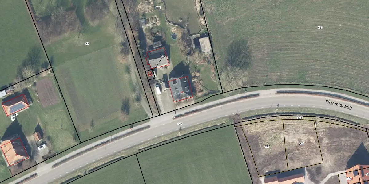 Het perceel waarop Deventerweg 54 staat heeft een oppervlakte van 4132 m². Dit is een zeer groot perceel. De perceeloppervlakte wordt geregistreerd door het Kadaster. Gedetailleerde informatie over de maten van dit perceel kunt u vinden in het rapport Kadastrale kaart met maatvoering van Deventerweg 54.