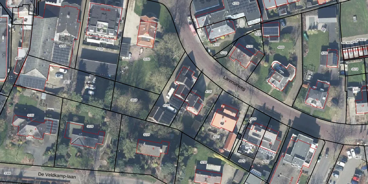 Het perceel waarop Larenseweg 2-A staat heeft een oppervlakte van 513 m². Dit is een groot perceel. De perceeloppervlakte wordt geregistreerd door het Kadaster. Gedetailleerde informatie over de maten van dit perceel kunt u vinden in het rapport Kadastrale kaart met maatvoering van Larenseweg 2-A.