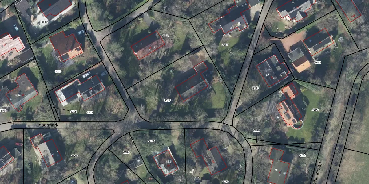 Het perceel waarop Looërmark 55 staat heeft een oppervlakte van 1541 m². Dit is een zeer groot perceel. De perceeloppervlakte wordt geregistreerd door het Kadaster. Gedetailleerde informatie over de maten van dit perceel kunt u vinden in het rapport Kadastrale kaart met maatvoering van Looërmark 55.
