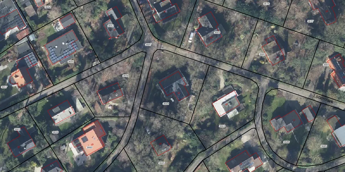 Het perceel waarop Looërmark 61 staat heeft een oppervlakte van 1150 m². Dit is een zeer groot perceel. De perceeloppervlakte wordt geregistreerd door het Kadaster. Gedetailleerde informatie over de maten van dit perceel kunt u vinden in het rapport Kadastrale kaart met maatvoering van Looërmark 61.
