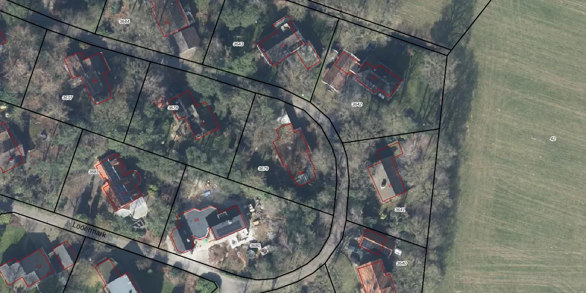 Het perceel waarop Looërmark 68 staat heeft een oppervlakte van 992 m². Dit is een groot perceel. De perceeloppervlakte wordt geregistreerd door het Kadaster. Gedetailleerde informatie over de maten van dit perceel kunt u vinden in het rapport Kadastrale kaart met maatvoering van Looërmark 68.