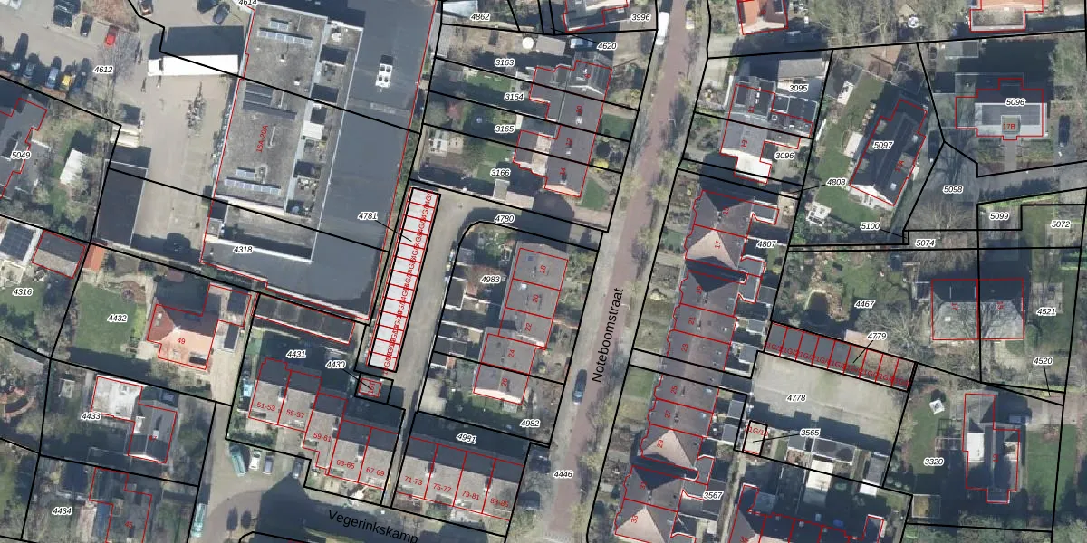 Het perceel waarop Noteboomstraat 18 staat heeft een oppervlakte van 638 m². Dit is een groot perceel. De perceeloppervlakte wordt geregistreerd door het Kadaster. Gedetailleerde informatie over de maten van dit perceel kunt u vinden in het rapport Kadastrale kaart met maatvoering van Noteboomstraat 18.