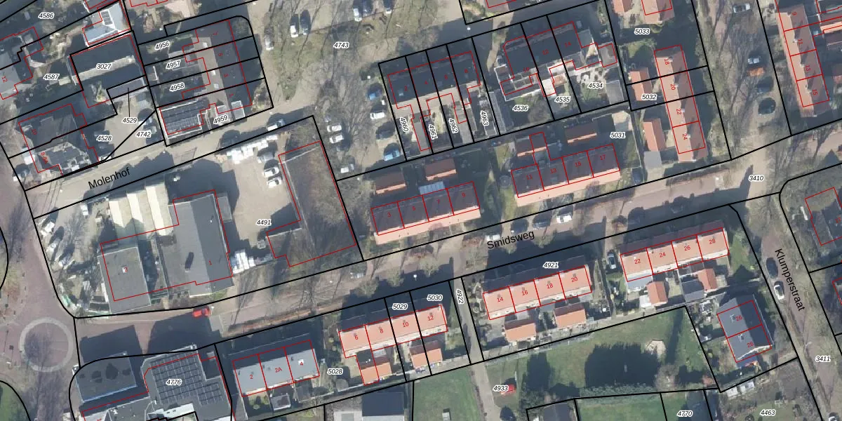 Het perceel waarop Smidsweg 5 staat heeft een oppervlakte van 1790 m². Dit is een zeer groot perceel. De perceeloppervlakte wordt geregistreerd door het Kadaster. Gedetailleerde informatie over de maten van dit perceel kunt u vinden in het rapport Kadastrale kaart met maatvoering van Smidsweg 5.
