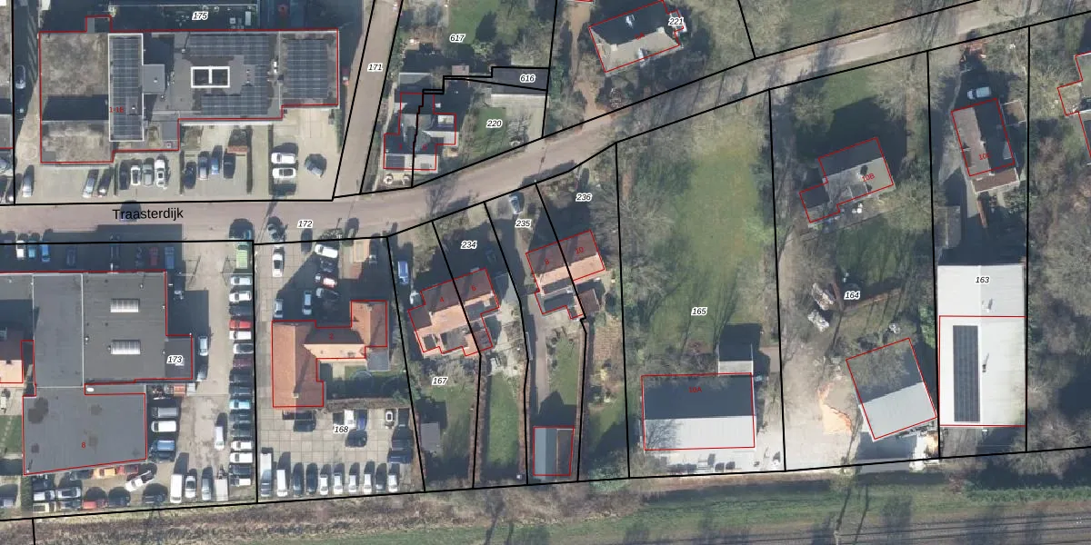 Het perceel waarop Traasterdijk 8 staat heeft een oppervlakte van 570 m². Dit is een groot perceel. De perceeloppervlakte wordt geregistreerd door het Kadaster. Gedetailleerde informatie over de maten van dit perceel kunt u vinden in het rapport Kadastrale kaart met maatvoering van Traasterdijk 8.