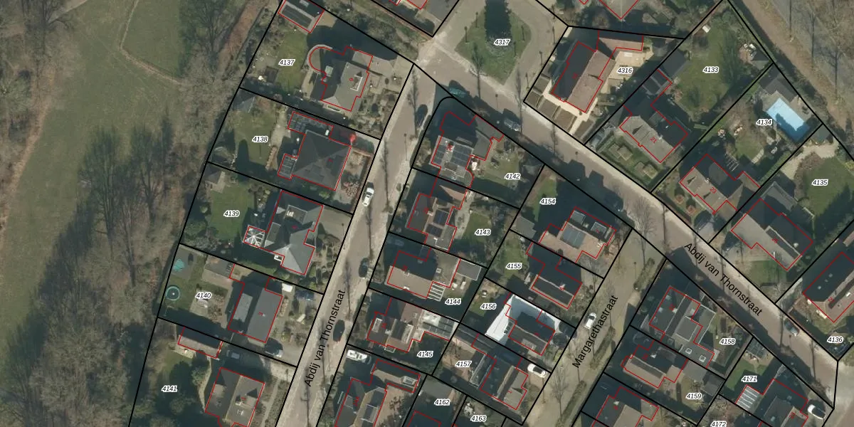 Het perceel waarop Abdij van Thornstraat 20 staat heeft een oppervlakte van 419 m². Dit is een groot perceel. De perceeloppervlakte wordt geregistreerd door het Kadaster. Gedetailleerde informatie over de maten van dit perceel kunt u vinden in het rapport Kadastrale kaart met maatvoering van Abdij van Thornstraat 20.